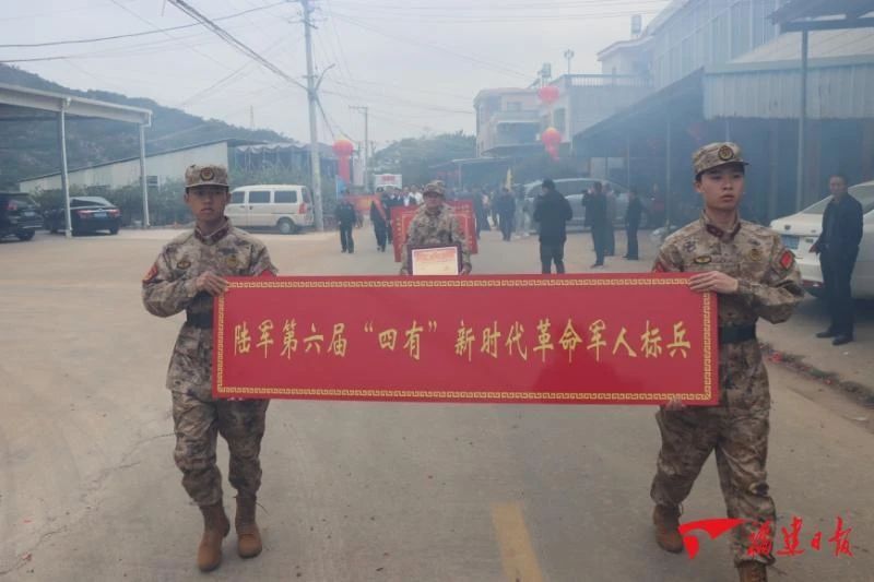 2月23日,由漳浦縣縣長吳丁順等一行人組成的軍地送喜報慶功團隊,一路敲鑼打鼓、鞭炮齊鳴,把“陸軍第六屆‘四有’新時代革命軍人標兵”喜報送到林莉君家中。在送喜報儀式現場,漳浦縣領導代表分別為林莉君及其家人佩戴綬帶、送上慰問金、鮮花及暖心祝福,并合影留念。