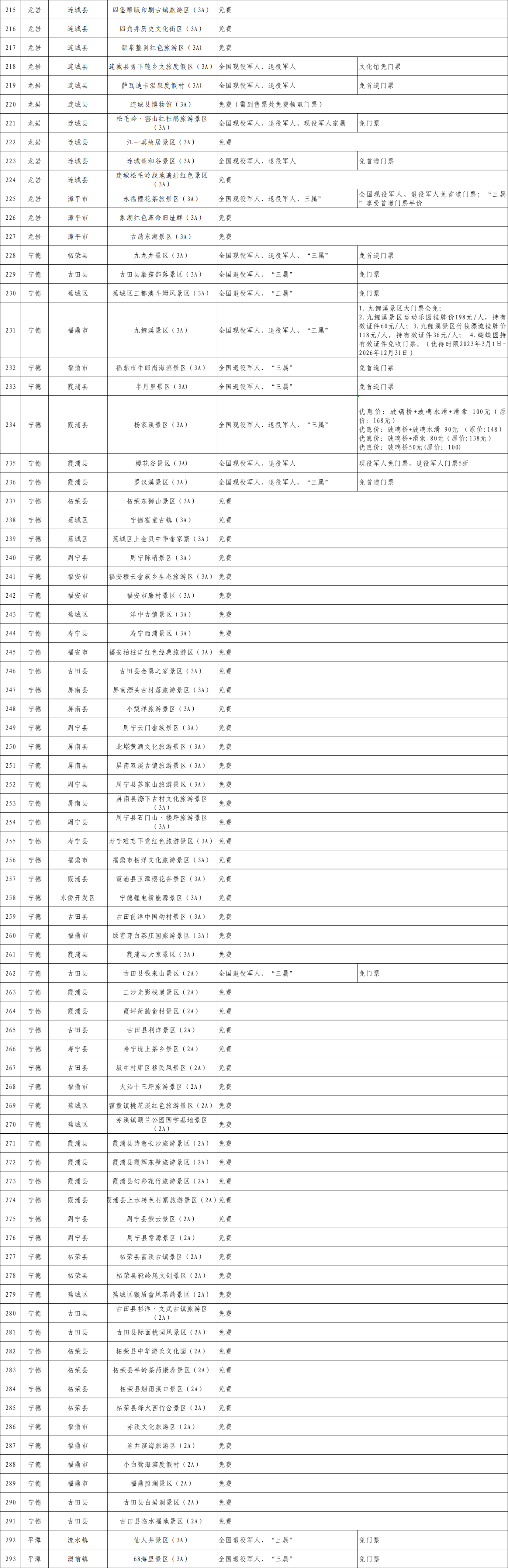 尊崇不間斷,優待常出新。近日,福建省退役軍人事務廳聯合省文化和旅游廳全力推動近300家A級景區,面向退役軍人及其他優撫對象提供優待政策,有的門票五折,有的全免。其中,5A級景區11家12處、4A級景區84家、3A級以下景區197家。 下面,讓我們看看具體減免門票的景區。友情提醒您:出游前,記得攜帶優待證! 福州市三坊七巷歷史文化街區(5A) 優待對象范圍:全國現役軍人、退役軍人、“三屬” 廈門市鼓浪嶼風景區(5A) 優待對象范圍:全國現役軍人、現役軍人家屬、退役軍人、“三屬” 漳州市福建土樓(南靖)旅游區(5A) 優待對象范圍:全國現役軍人、退役軍人、“三屬” 武夷山市武夷山風景名勝區(5A) 優待對象范圍:全國退役軍人、“三屬”、全國愛國擁軍模范、全國擁政愛民模范 福建省A級旅游景區優待項目清單 (點擊圖片可查看大圖)圖片