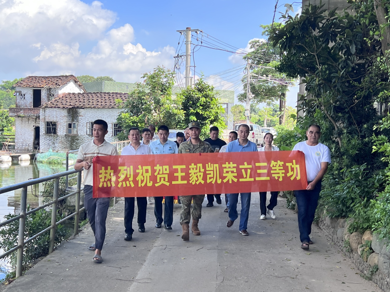 軍營建功勛,家鄉傳美名。7月3日上午,伴隨著陣陣鑼鼓聲,龍文區人武部和區退役軍人事務局組成報喜慰問組,來到朝陽街道恒坑村榮立三等功的現役軍人王毅凱家中。在喜慶又熱烈的氛圍中,將“三等功”喜報和慰問金送到軍屬手中,并為他們佩戴了榮譽綬帶,向立功受獎家庭表示衷心的感謝,對軍屬的辛勤付出表示由衷的敬意。