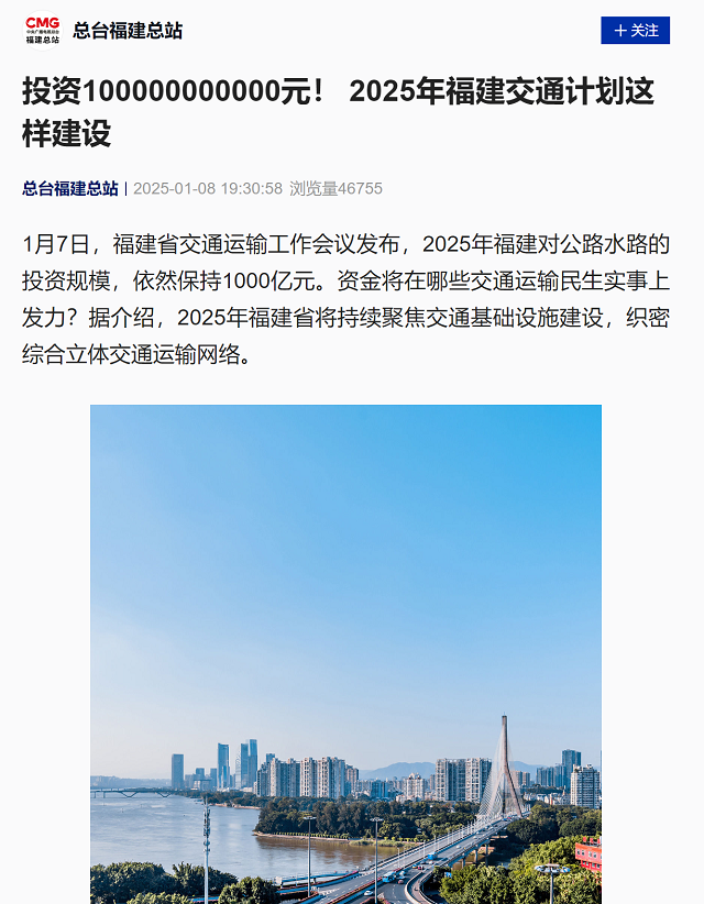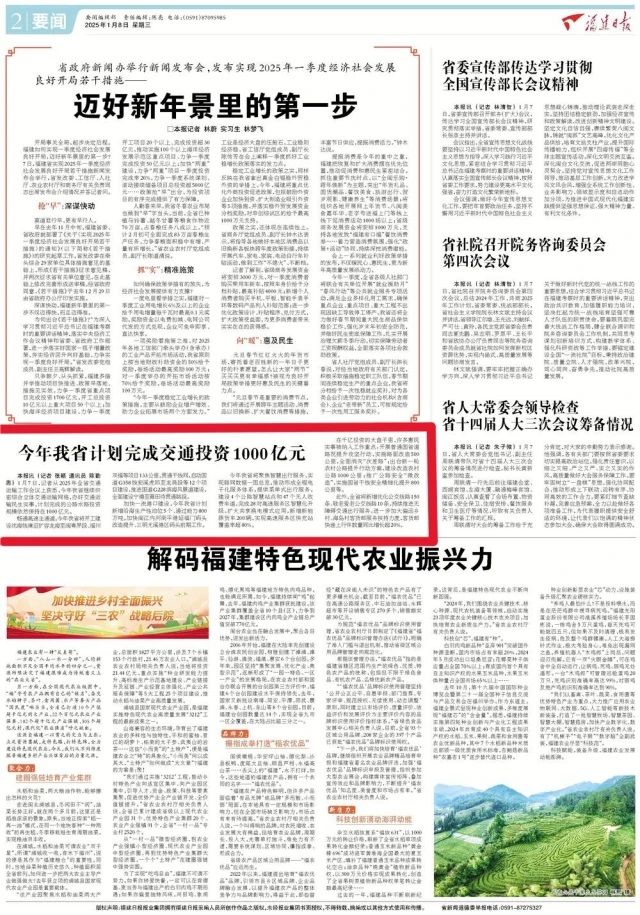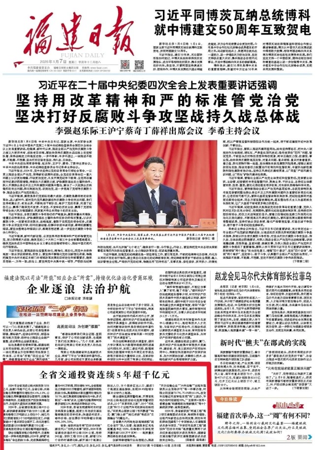 1月7日,2025年全省交通運輸工作會議召開?!哆B續5年超千億元:福建省交通投資保持高位運行》《福建交通今年計劃完成投資1000億元》在新華網、人民日報、央視網、央廣網、學習強國、中國經濟網、海峽網、福建日報、齊魯晚報等媒體報道。各大媒體全方位介紹省交通運輸廳在2024年為經濟大盤筑牢發展硬支撐的成就,并聚焦我省2025年交通運輸工作計劃。 福建電視臺