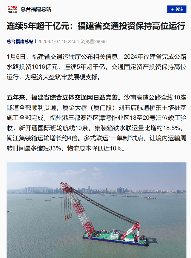 福建新聞聯播丨全省交通投資連續5年超千億元