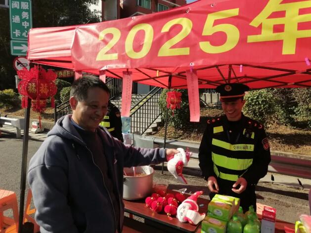廈門高速執法支隊聯合地方交通執法、高速運營、消防、應急等單位在同安收費站外廣場開展志愿服務活動,通過春節寄語、有獎競猜、寫春聯、寫福字等環節,為司乘人員送出春聯、中國結、福字窗貼、蛇年吉祥物、愛心銀耳羹等暖心禮品。同時,執法員聯合消防員向駕駛員講解冬季安全出行、處置汽車火情等知識,幫助對車況進行檢查、排除行車隱患,一同攜手共筑春運平安路。