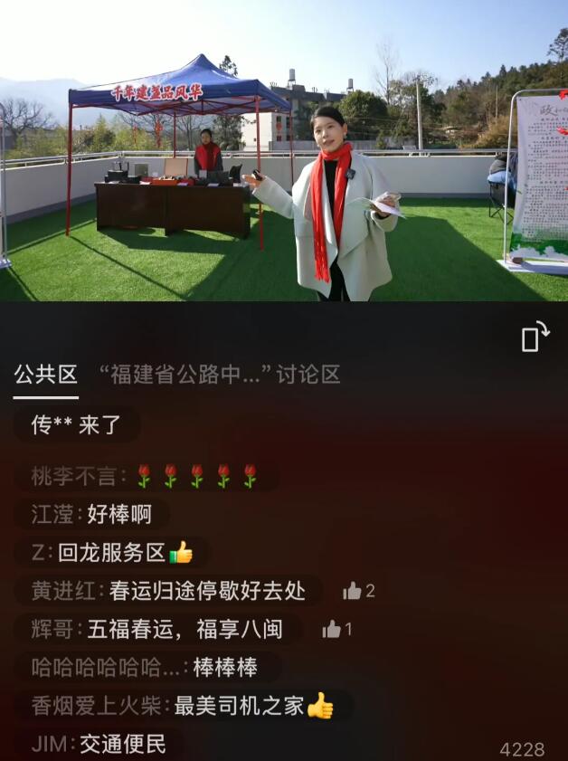“師傅,給您送福啦!這是我們志愿者自己寫的‘?!趾痛郝?,祝您新年快樂,一路平安!”書法愛好者們提筆蘸墨,把對新年的美好愿景融入一張張“?!弊趾痛郝撝?,送給過往司乘人員,貼心的服務讓司乘人員感受到了家的溫暖。 “回龍服務區在去年獲評福建省‘最美工會驛站’,讓我們一起走進這座溫馨驛站看一看吧?!被顒蝇F場,主持人在線上直播向廣大網友介紹公路驛站的活動情況,通過圖片、視頻展示了武夷山國家公園1號風景道、崇陽溪漫游道、網紅水杉公路等線路的美景和特色,邀請大家在春節假期期間一同前往游覽打卡,隨機采訪在“共享司機之家”休憩的司乘人員,向他們宣傳春運安全出行小知識,倡導養成良好的安全行車習慣,贈送“平安?!?、愛心禮包,畫面中充滿了幸福歡笑與舒適愜意。