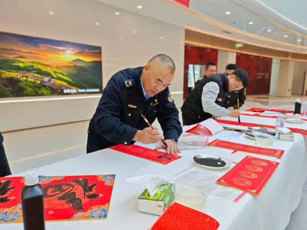 泉州高速執法支隊聯合高速交警、高速運營等單位在泉南高速達埔服務區開展志愿服務活動,多部門書法愛好者組團揮毫潑墨,寫下春聯和“?!弊炙徒o現場旅客。