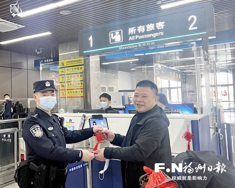 邊檢民警為馬祖鄉親送上中國結。通訊員 范海超 攝 在黃岐客運站,福州邊檢站的民警同樣忙碌。 “歡迎您,新年快樂!送您一對中國結,祝您蛇年大吉,萬事如意!”28日上午,福州黃岐口岸旅檢現場,見到來榕過年的馬祖鄉親王松官,福州邊檢站民警曾仕杰用福州話為他送上傳統手工藝品。 “謝謝您的禮物,新年快樂!過年就是要紅紅火火、團團圓圓!尤其是聽到家鄉話感覺特別親切!”王松官開心地說。 當天,除了來榕過年的,還有不少馬祖鄉親前來采購年貨。 “喲,買了不少東西呢!”旅檢現場,看到采購年貨的馬祖鄉親曹雅婷推著幾大箱海鮮干貨,邊檢民警胡鑫趕緊上前幫忙。 “現在從馬祖乘坐‘小三通’航線到黃岐,才25分鐘左右,我平時一有空就喜歡來逛逛?!辈芘空f。 記者看到,曹女士買的物品中有鮑魚干、鰻魚干、干貝、黃魚酥、魚面等?!斑@些是我們家人喝茶時配著吃的,這個是我朋友指定要幫她買的……”曹女士說。 “回來是家,回去也是家,我們會讓這雙向奔赴的團圓更加溫暖!”福州邊檢站邊檢處副處長張明娟介紹,針對春運期間臺胞家庭人數較多,攜帶兒童、大件行李通關不便的實際,該站推出“合家歡”親情通道、“手牽手”專屬通道等服務舉措,同時派出“鄉音小分隊”提供福州話、閩南話服務,讓臺胞回家路既有速度又有溫度,助推福馬“同城生活圈”建設提速。 據福州邊檢站統計,1月14日至1月28日,福馬“小三通”共開航112班次,比去年同期增長86%,累計運送旅客約4700人次,同比增長57%。(記者 唐蔚嬙 張鐵國 通訊員 范海超) |