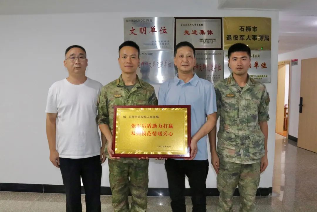 近日,來石駐訓部隊專程來到石獅市退役軍人事務局,將一塊印有“強軍后盾助力打贏,雙擁模范情暖兵心”的牌匾鄭重贈予該局工作人員。這塊沉甸甸的牌匾,飽含著駐訓部隊官兵對石獅市擁軍優屬、服務保障工作的高度認可和誠摯謝意,生動詮釋了新時代軍民魚水深情。