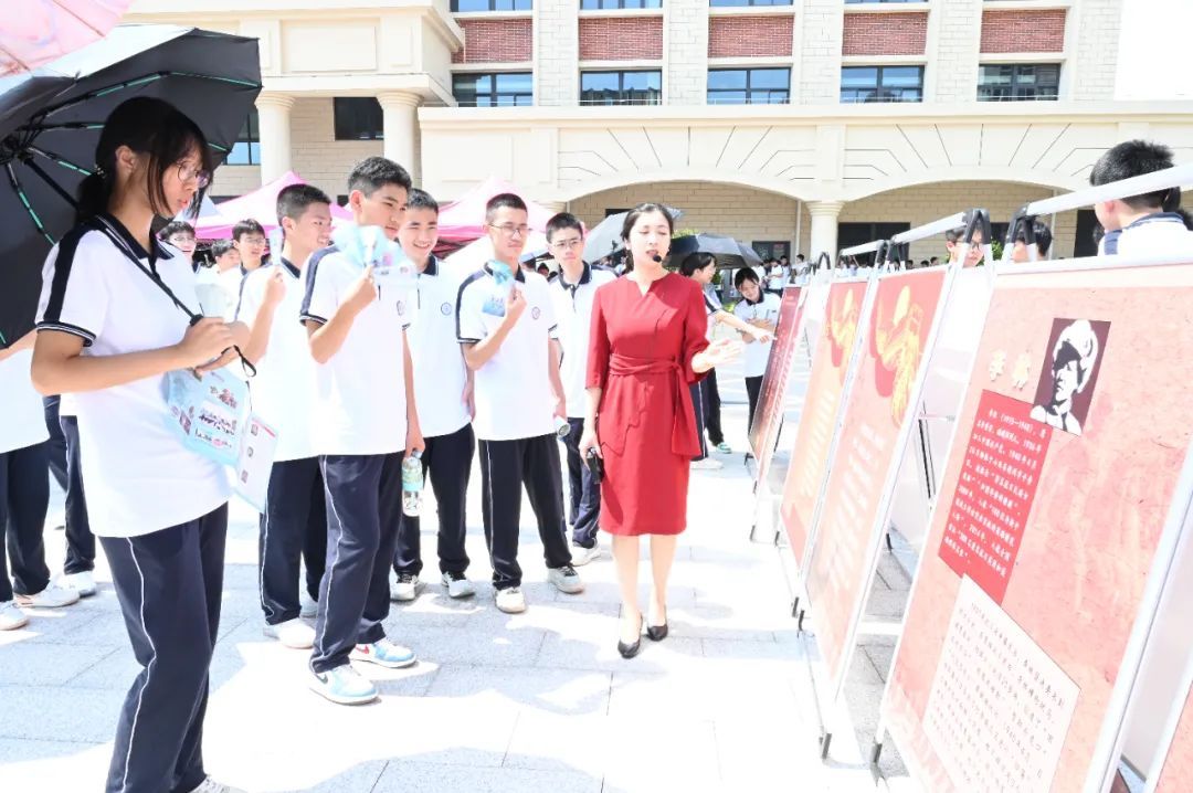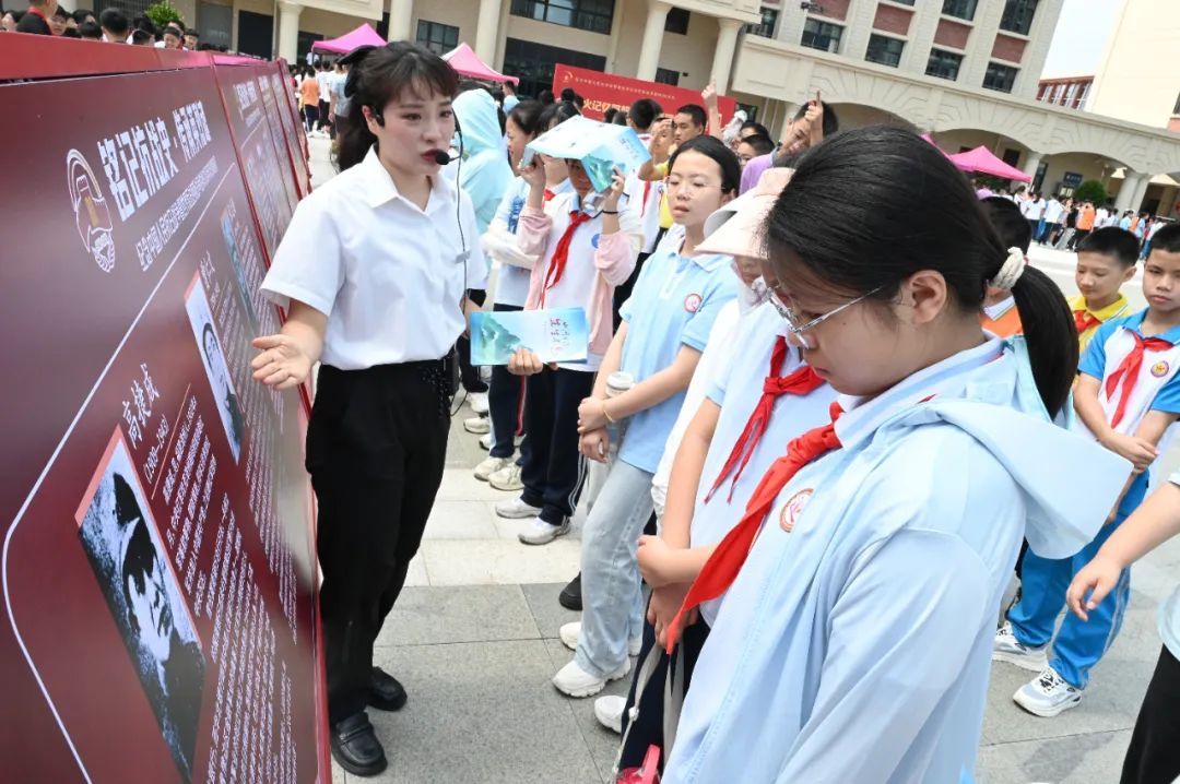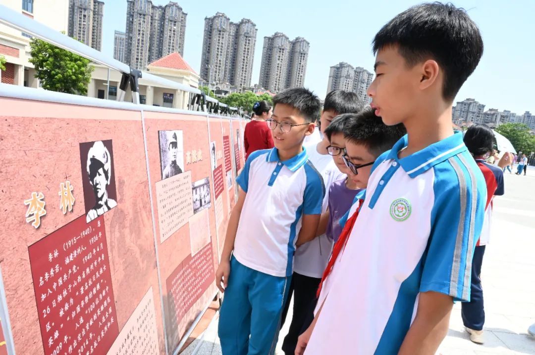 操場兩側排列著不同主題的展區與體驗項目,學生們不再是坐在禮堂里被動聽講,而是走進一個個情境之中,成為歷史的親歷者、感受者和發問者。 不遠處的抗戰英烈事跡展區,十塊圖文展板靜靜矗立,呈現全國及漳州本地抗戰英烈的感人故事。展板前,漳州市烈士紀念設施保護中心的講解員動情講述,學生們凝神傾聽,一本本英烈事跡宣傳冊在他們手中傳遞。年輕的面孔與黑白照片中的英雄,仿佛在這一刻跨越時空相遇。