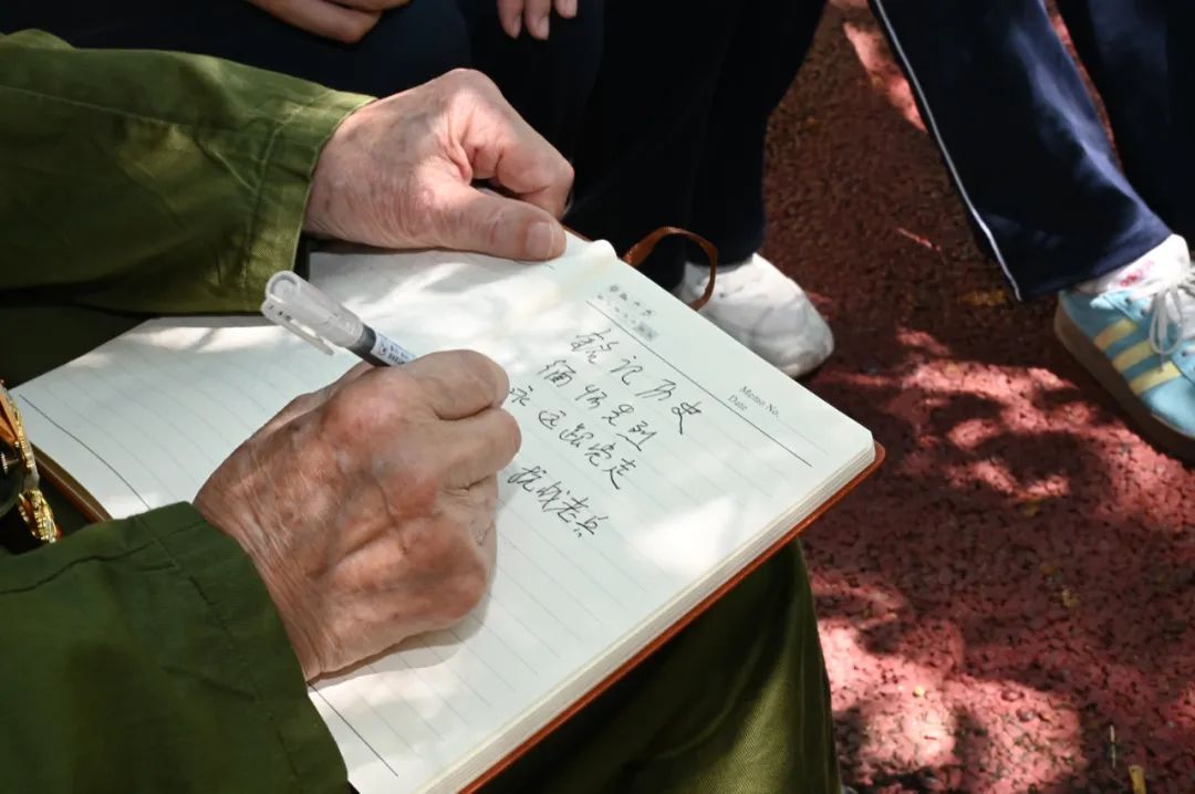 “張爺爺,您當時害怕嗎?”“這枚紀念章對您來說意味著什么?”交流中,學生們踴躍提問,張老一一回答,并提筆勉勵大家:“銘記歷史,緬懷先烈,永遠跟黨走!”寫到動情處,他忍不住拍了拍學生的肩頭。