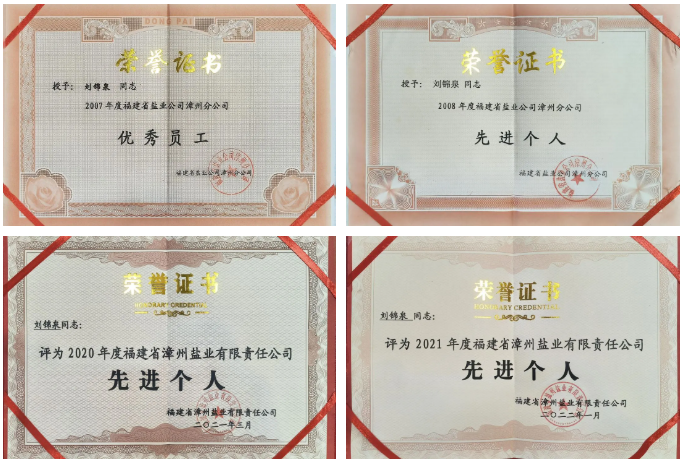 劉錦泉在工作崗位獲得的榮譽證書 初心如磐:守護“舌尖安全” 2023年8月,日本核污水排海引發食鹽市場波動。這對于一名鹽業客戶經理來說,是一場沒有硝煙的戰爭。 “別慌,有國家在,有我們在,鹽管夠!”這是劉錦泉對每一位焦慮的客戶和市民說得最多的一句話。他第一時間行動起來,在微信群、朋友圈轉發官方權威信息,耐心做好宣傳解釋,用專業與擔當筑起一道“民心防線”。 憑借多年積累的客情網絡,他提前預警,迅速協調。在最緊張的那三天兩夜里,他幾乎沒有安安穩穩地睡過一覺。手機被打得滾燙,一邊是安撫焦急的經銷商,了解他們的庫存和需求;另一邊是高頻次地與配送中心、物流車輛溝通,協調運力,爭取貨源。一天凌晨,嚴重缺覺的他仍在親自跟車配送,確保一批緊急調撥的食鹽能準時送達當地最大的連鎖超市。超市經理看到他布滿血絲的雙眼,感慨地說:“有你們在,我們就放心了!” 在那場風波中,劉錦泉成功協調調運了上百噸小包裝食鹽,他所負責的區域,市場供應穩定、價格平穩,沒有出現一例斷供或漲價事件。他用實際行動,再次守住了自己的“陣地”,守住了“人民的鹽”。 微光成炬:平凡脊梁照亮人間煙火 晚上七點,劉錦泉結束了一天的巡訪,駕車返程。城市燈火漸次亮起,如散落人間的星子。車停穩,他打開微信工作群,認真編輯著當天工作日志...... 鹽,依舊潔白如雪;初心,始終堅如磐石。 這份初心,來自八十年前烽火中的錚錚鐵骨,也來自此刻平凡崗位上的默默執著。它從爺爺的手中,傳遞到他的肩上,最終融化在每一粒鹽、每一餐飯里,落在一個普通福鹽人的脊梁上。這,既是一個家庭的精神傳承,更是無數福鹽人融入血脈的共同寫照——那份對國計民生的責任與擔當,無聲,卻足以照亮歲月,共同溫暖八閩大地的人間煙火。 |