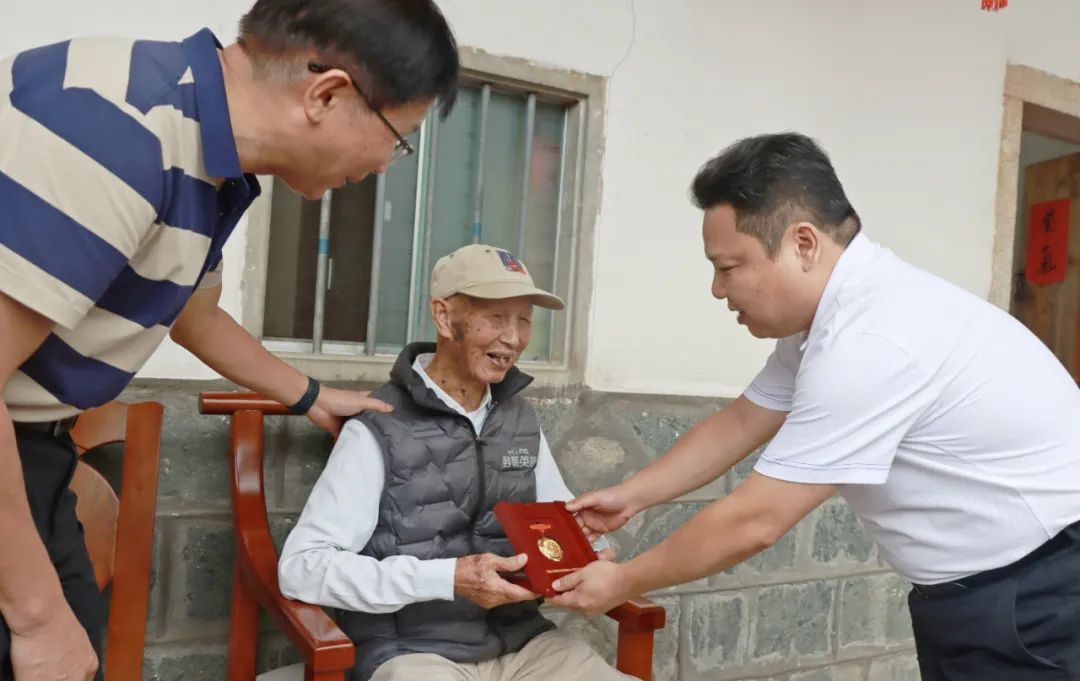 1945年,蔡友琳隨軍參加閩東追擊戰,一心盼著戰爭早日結束??箲饎倮南鱽?,整個駐地歡騰一片,“大家都希望可以過太平日子了”。部隊改編后,蔡友琳選擇離開軍隊,在廈門短暫工作。1949年,思鄉心切的蔡友琳步行回到長泰老家務農,終于迎來安穩的生活?!拔揖鸵宦纷呋丶?,肚子實在餓得不行,就向沿途的人家討點吃的?!边@條返鄉路,他走得艱難,卻滿懷希望。 回鄉后,蔡友琳結婚生子,子女孝順,家庭和睦。如今老人身體尚可,只是聽力有些下降。自2015年5月起,蔡友琳開始接受公益基金助養金資助。社會的關懷如涓涓細流,溫暖著這位曾為國家奮戰的老兵。2015年,蔡友琳獲頒“中國人民抗日戰爭勝利70周年”紀念章;十年后,又一枚紀念章承載著時代的敬意,佩戴在他的胸前。 “戰爭是極其殘酷的,和平就是最大的幸福?!边@是蔡友琳常掛在嘴邊的話,也是他一生最深刻的領悟。 從戰火紛飛到安居樂業,從硝煙彌漫到村莊寧靜,他的人生猶如一部行走的歷史書,見證著一個國家從苦難走向復興的偉大歷程。長泰區、鎮領導時常前來探望,關心他的身體和生活,聆聽他講述抗戰往事?!翱箲鹄媳敲褡宓募沽?,是歷史的見證者,”長泰區領導表示,“他們的英勇事跡和愛國精神值得永遠銘記與傳承。我們將繼續做好參戰老兵的關懷工作,嚴格落實優撫政策,讓英雄安享晚年?!?/p>