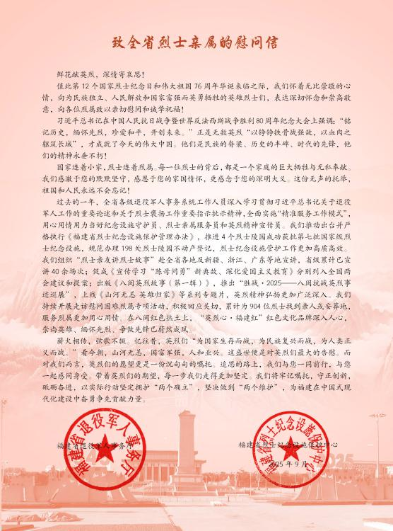 近日,一封飽含尊崇與深情的慰問信,以特快專遞或者志愿者上門送達的形式,送到全省烈士親屬的手中。這是省退役軍人事務廳在今年“9·30”烈士紀念日和新中國76周年華誕來臨之際,連續第3年向全省烈士親屬送上慰問信。