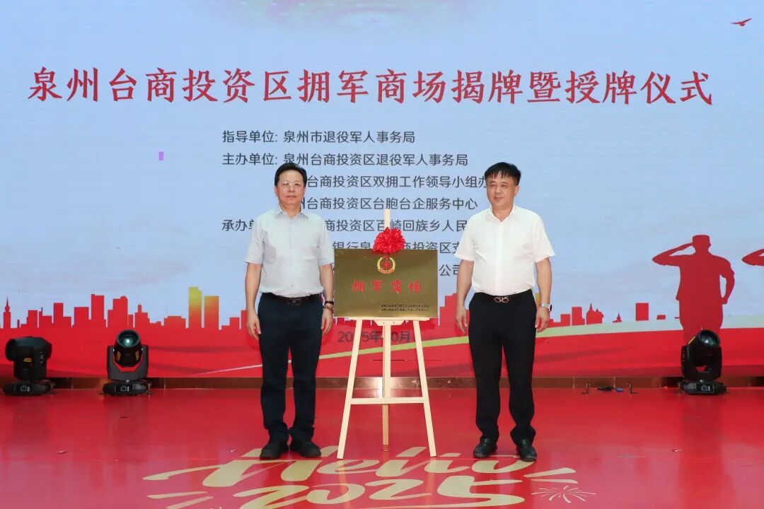 近日,泉州臺商投資區首個“擁軍商場”在臺商湖東廣場正式揭牌亮相,標志著臺商投資區擁軍優屬工作邁入新階段。首批21家品牌商戶被授予“擁軍門店”稱號,涵蓋餐飲、零售、生活服務等多個領域,共同承諾為軍人軍屬提供優質優惠服務。 本次儀式由泉州市退役軍人事務局指導,泉州臺商投資區退役軍人事務局、區雙擁辦、區臺胞臺企服務中心主辦。區黨工委副書記劉敏堅等相關領導出席活動,與擁軍商家代表、退役軍人代表等共同見證這一重要時刻。