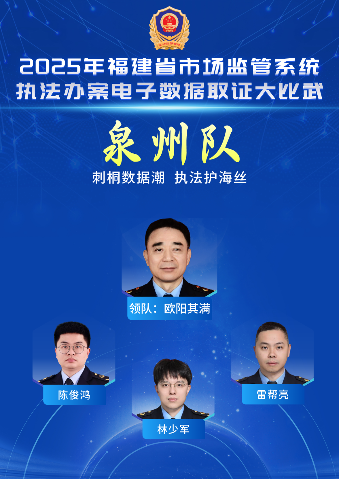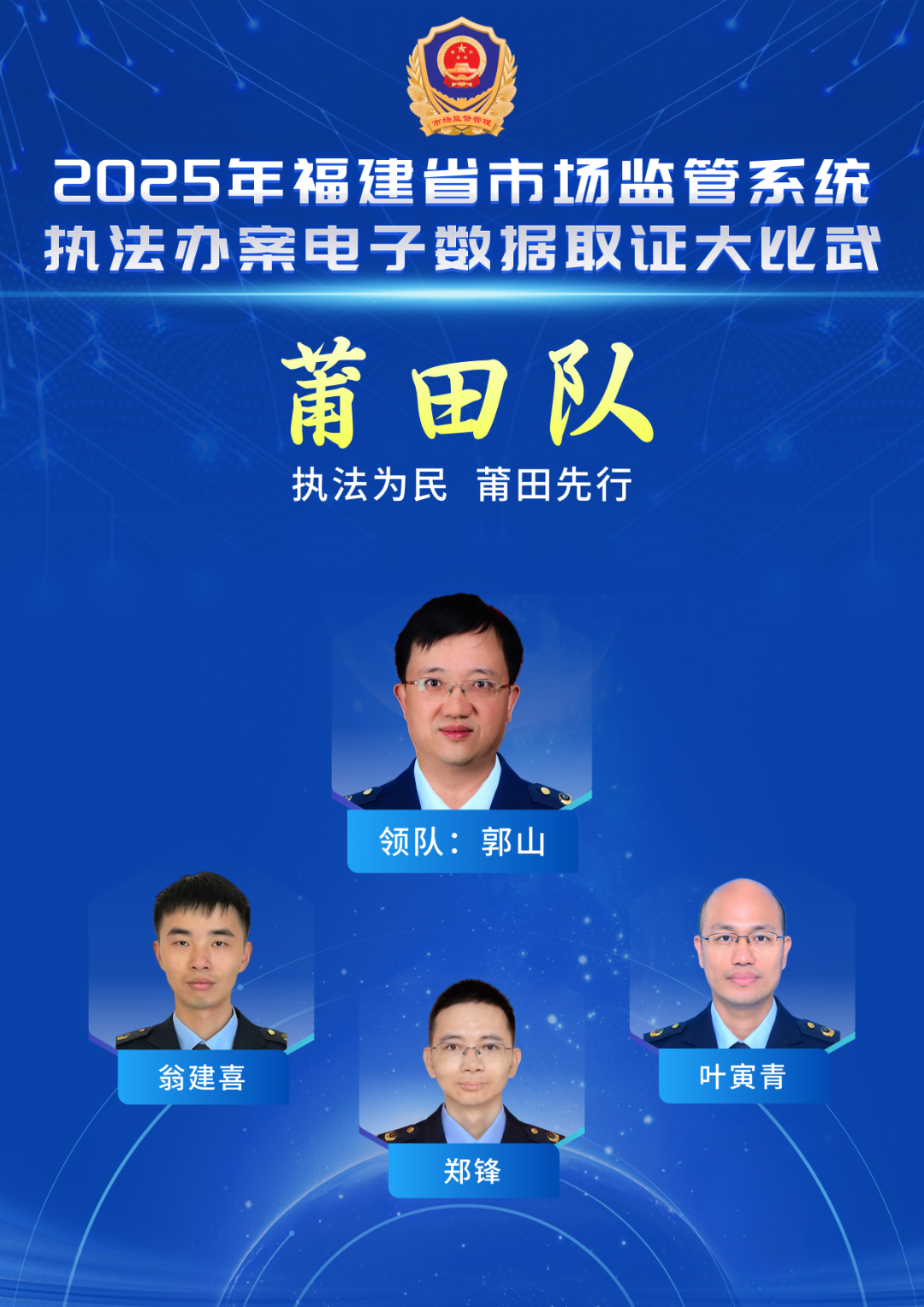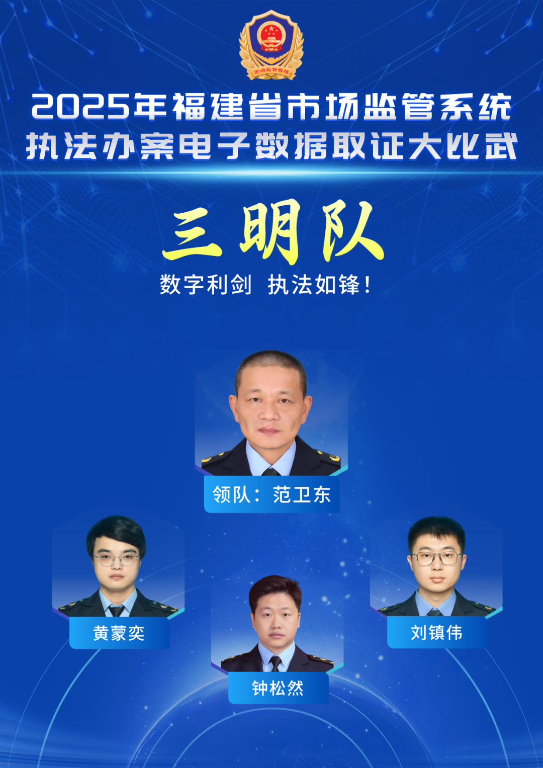 為將“三爭”行動和“九大工程”的戰略部署切實轉化為實戰能力,進一步夯實全省市場監管執法隊伍專業知識,2025年10月24日,一場圍繞電子數據取證的巔峰對決即將上演——2025年福建省市場監管系統執法辦案電子數據取證大比武重磅來襲! 與往年相比,本次大比武在賽制上全面升級,經過8-9月為期四周的“電子數據取證線上課堂”培訓及線上選拔環節,最終遴選出30名執法精兵作為本次大比武參賽選手,并在賽前組織為期三天的線下集中培訓,全面強化實戰能力。來自各設區市(含平潭綜合實驗區)的10支代表隊將在6個小時內進行包括現場勘查取證、理論答題與電子數據取證分析三大模塊的比拼。選手們將憑借清晰的辦案思路、扎實的法律功底與嫻熟的取證技術,全面檢驗崗位大練兵成效,生動展現福建市場監管執法隊伍精湛的業務水平與昂揚的精神風貌。 下面 有請他們閃亮登場 看他們在數字與現實深度交織的戰場上 巔峰對決 福州代表隊